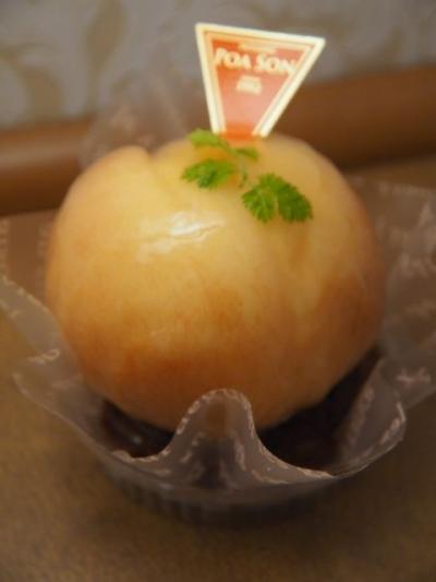桃は、種をくり抜いてあり、中に生クリームを詰めている。