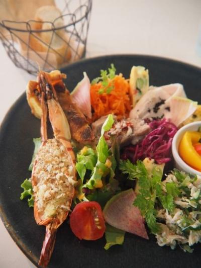 メインのプレートに、夏野菜のキッシュ、海老のパン粉焼き、鶏胸肉のハム、ミニトマトのコンポート、カボチャサラダ、コールスロー等、多彩な料理が少しずつ盛られている。