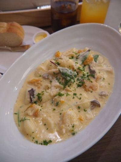 メインのパスタである蒸し鶏と南瓜 ニョッキのきのこクリームソースは、ニョッキを蒸し鶏と南瓜と共にきのこのクリームソースで和えてあった。ニョッキは、小麦粉とジャガイモから作られたパスタというか、ミニ団子で、餅かと思ってしまう程のもっちりした食感が特徴。物凄く腹に溜まっていく感じ。パンはお替り可能となっていて、普段は遠慮無くお替りするが、今回はその必要が無かった。- 旅行時期