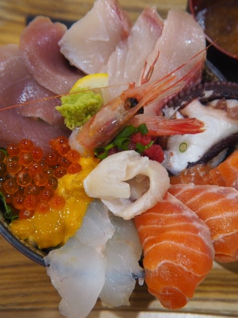 甘エビ、サーモン、マグロ、ハマチ、イクラ、ウニ、タコ等が豪快に、隙間無く、彩りよく盛られている。お陰で、下の酢飯が全く見えない。
