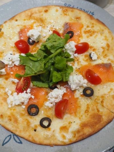 薄い、パリパリ・サクサクのピザ生地に、スモークサーモン、リコッタチーズ、トマト、ルッコラ、オリーブをトッピング。