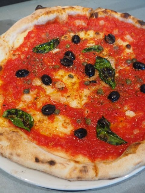 トマトソース、オレガノ、ニンニク、アンチョビ、ケイパー、オリーブ、バジルがトッピングされている。