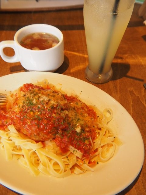 ハンバーグのせミートソースバスタは、ランチメニューの1種。