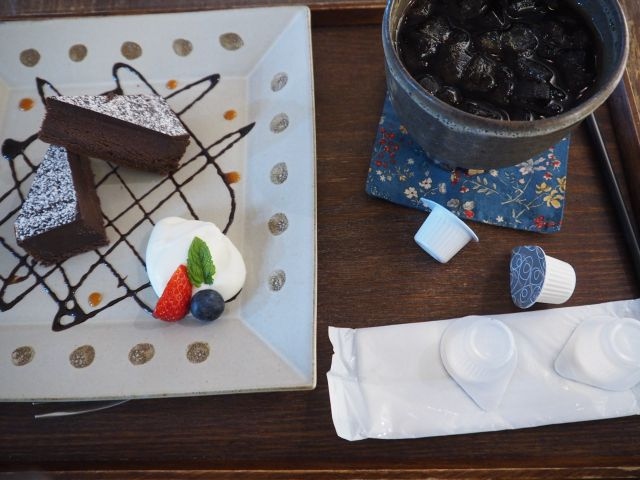 ケーキもドリンクも数種類から選べる。今回、ケーキをガトーショコラ、ドリンクを深山コーヒー(水出しコーヒー)にした。