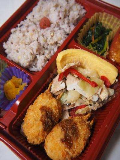 カニコロッケをメインにした弁当。カニの爪が突き出ていて、カニ肉を実際に使っている、と印象付けている。