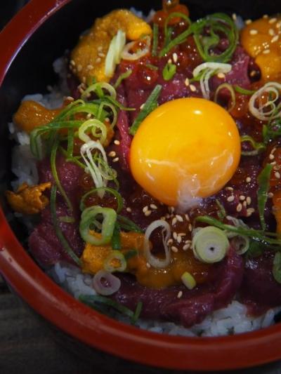 円形の豪華に見える重箱の中にご飯を敷き詰め、馬刺し、ウニ、イクラをトッピングし、中央に卵黄を落としてある。