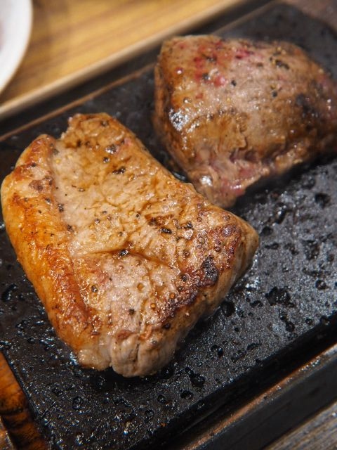 ステーキは、熱々の溶岩プレートに盛られて提供されるので、油が物凄く跳ねる。紙を被せてあるが、食べる際には紙をどかす必要がある。
