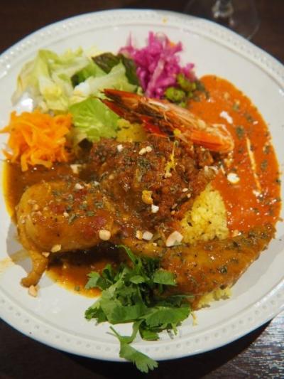 宮崎県産黒毛和牛の都萬牛(トマンギュウ)のキーマカレー、宮崎県産骨付きモモ肉チキンカレー、そしてカルダモン香るエビのトマトクリームカレーの3種のカレーが、サラダと共にワンプレートに盛られているという、豪華な内容のカレー。彩りも良い。。- 旅行時期