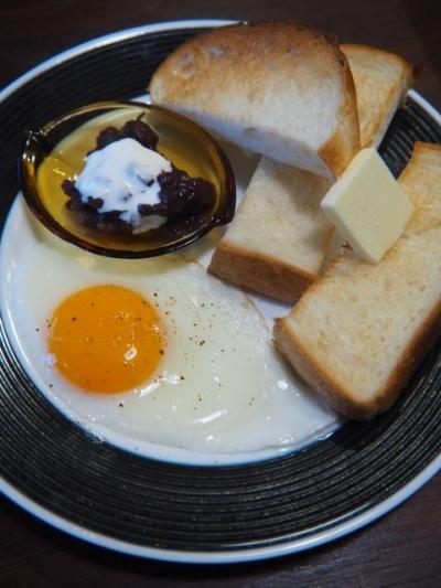トースト、バター、小豆、生クリーム、目玉焼き、コーヒーから成る。