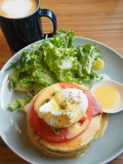 イングリッシュマフィンの代わりに、パンケーキの上にベーコン、トマト、ポーチドエッグを乗せ、オランデーズソースを掛けている。