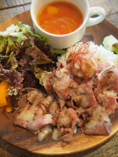 美里町の天然鹿肉のロースト(狩猟で得られた鹿の肉らしい)を、ライスとサラダとスープに沿えている。