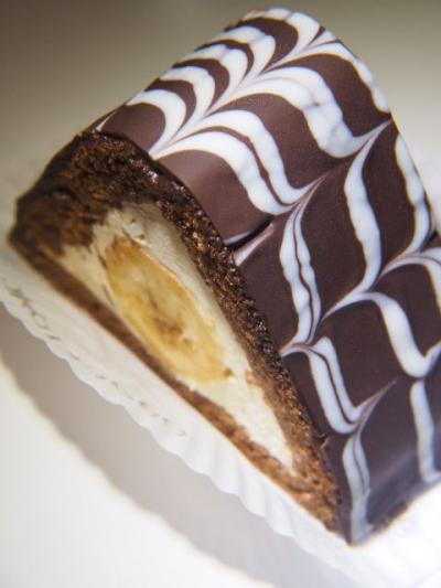 チョコレートスポンジでキャラメル入り生クリームとバナナを包み込み、全体をチョコレートガナッシュで覆っている。- 旅行時期