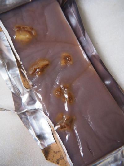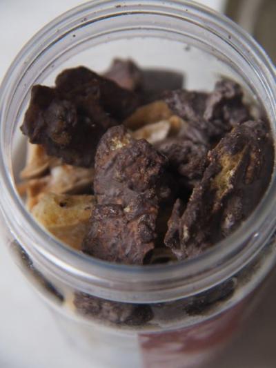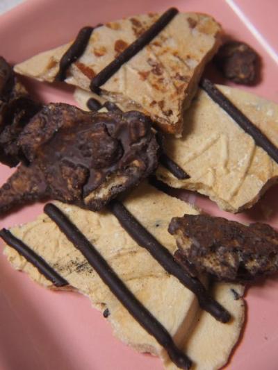 軽く、サクサクの小麦粉ベースのせんべいに、カシューナッツ入りのチョコレートを塗したものを砕いている。