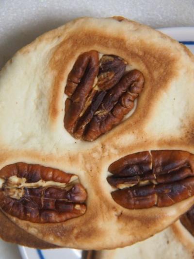 分厚いせんべいに、ピーカンナッツ3粒ずつ埋め込まれた状態で焼き上がっている。