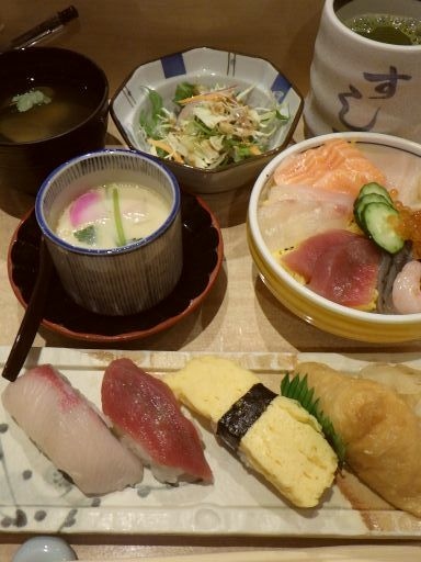 同店ではちらし寿司もにぎりも通常サイズで提供しているが、単品で注文せねばならず、セットとなるとこれしかない。- 旅行時期
