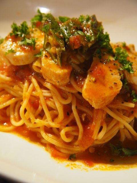 メインのパスタは、鶏胸肉の自家製ハムとオクラを、トッピングしたトマトソースのパスタだった。分厚くスライスされた鶏肉のハムが何枚もトッピングされていて、パスタに行き着かない。ハムはしっとりと柔らかく、鶏肉をどう仕込めばこの様に柔らかくなるのか、と不思議に思った。オクラを使っているのは、日本的。