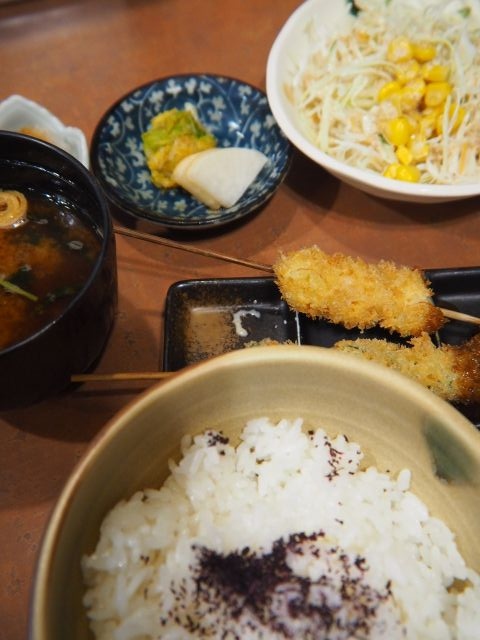 串揚げは、一本もしくは二本ずつ提供され、揚げたてのを食べられる様になっている。具材はその日ごとに異なる様で、今回はレンコンカレー風味、オクラとウィンナー、明太子ささ身巻き、アスパラガスのベーコン巻き、獅子唐、シメジ、サーモン等だった。