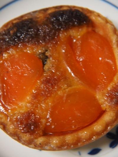 タルト生地に、小豆餡とケーキ生地を注ぎ、杏をトッピングして焼き上げている。