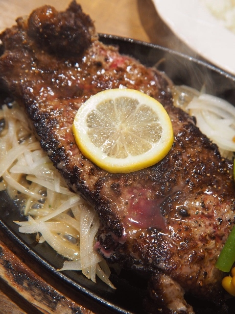 今回、ミディアムに焼いてもらった所、結構火が通った状態で提供されたが(熱々の鉄板皿の上に乗っていて、提供後も加熱される事もある)、それでも柔らかく感じた(焦げ目が付いている箇所はカリカリになっていて、これもまた良い食感だった)。