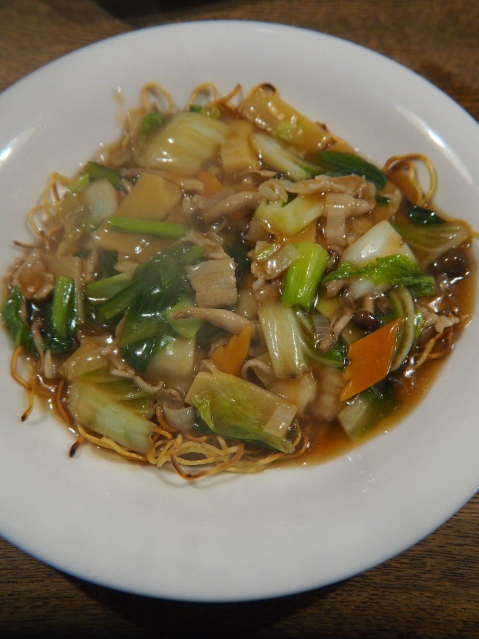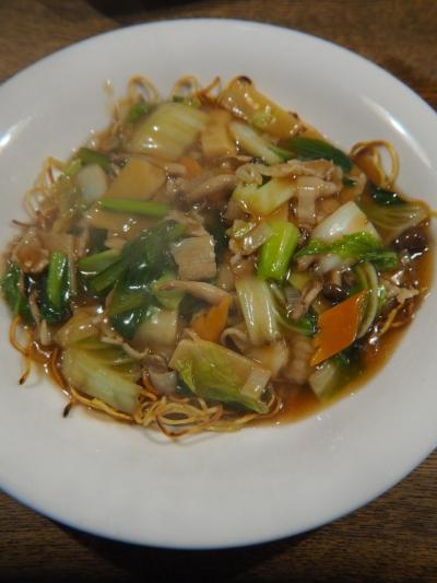 カリカリに揚げた麺に、五目のあんをたっぷり掛けている。