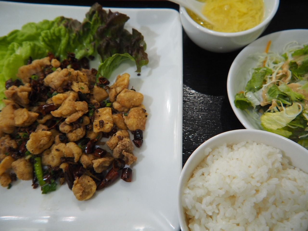 鶏の唐揚げを、唐辛子や山椒等の香辛料と共に炒めたもの。
