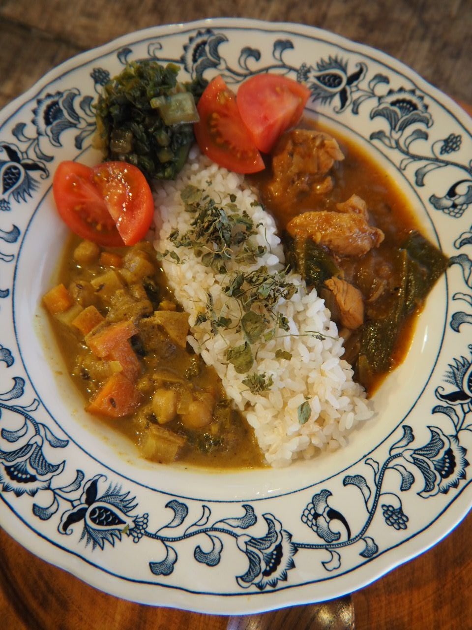 今回、左側がベジタブルタイ式カレー、南インドのトマトチキンとなる。