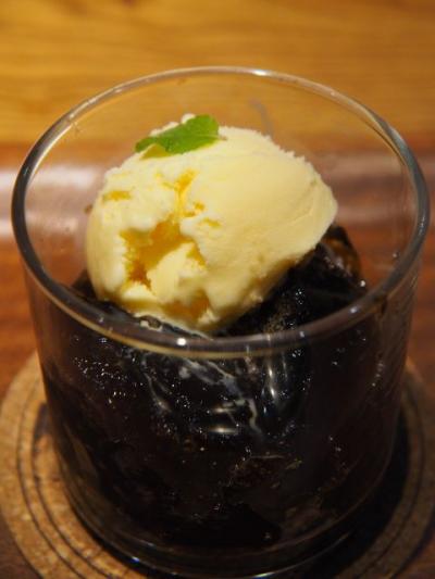 コーヒーゼリーに、バニラアイスクリームをトッピングしている。