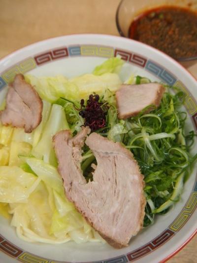 広島風のつけ麺で、辛さのあるつけ汁が入った器と、麺・キャベツ・ネギ・チャーシュー等の具が入った丼が提供される。