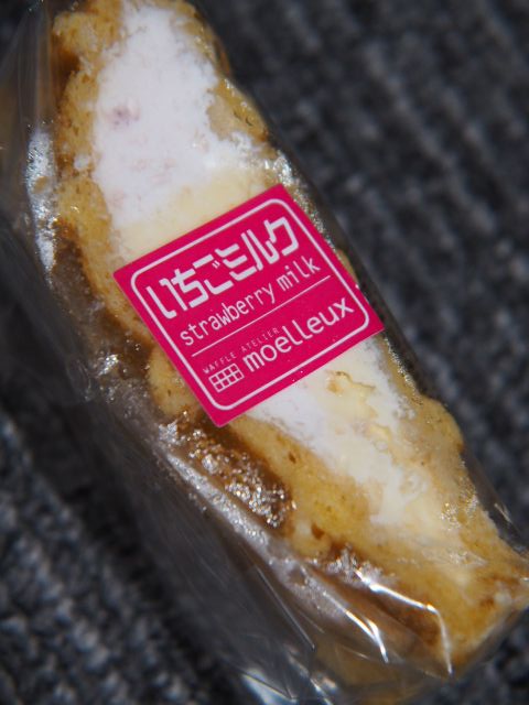 ふんわりタイプのワッフルで、イチゴミルク風味のクリームを挟んでいる。