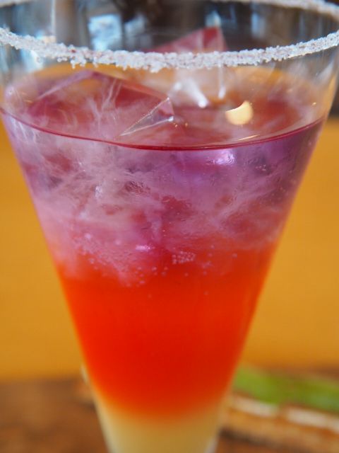 グラスに柚シロップ、グレナデン(ざくろ)シロップ、炭酸水、バタフライピーティーを順に注ぎ、カラフルな層を描いている。上の青は瀬戸内海、赤は大地、黄は柑橘を表しているという。飲む際は、思い切り混ぜてからいただく(混ぜるのが勿体無いくらい色鮮やか)。柚やざくろのフルーティーさと、ハーブティーの香りと、炭酸の泡を感じられる、爽やかなドリンク。- 旅行時期