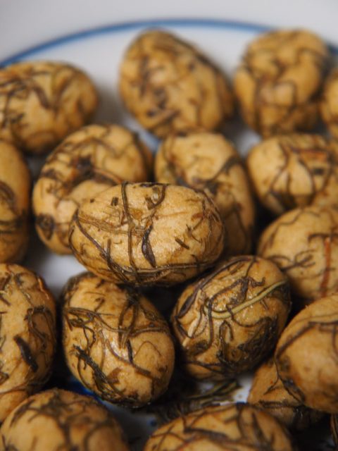 落花生を、小麦粉ベースの殻で覆い、昆布を塗したもの。