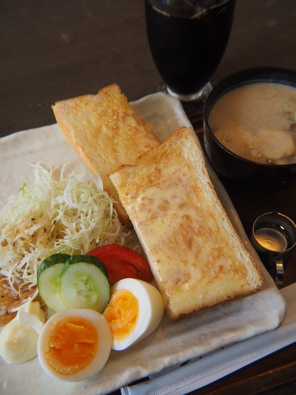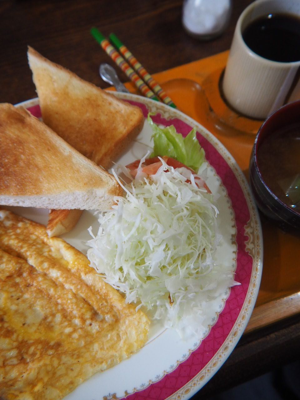 トースト、オムレツ、コーヒー、サラダ、味噌汁から成る。