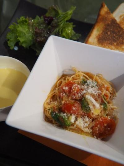 クロックムッシュ、サラダ、スープ、冷たいトマトソースのハーフパスタから成る。