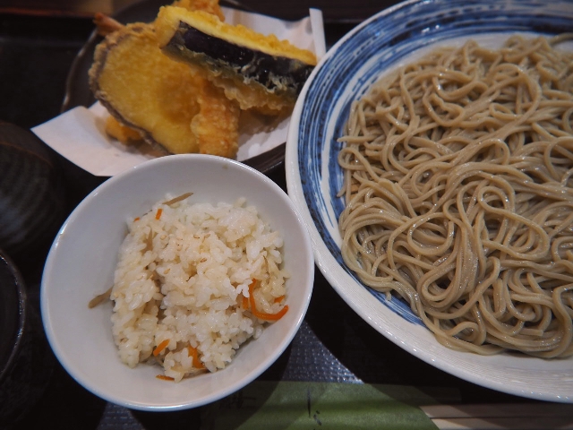 蕎麦、ご飯、天ぷら盛り合わせから成り立っている。