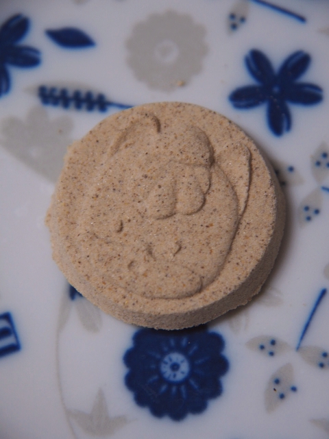 細かい粉末を固めた感じで、手に持った時点では硬いが、口の中に入ると解けて粉状になっていく。
