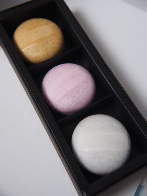 3種類のもかろんが箱に収まっている(つぶあん(焦がし)、ごまあん(ピンク)、ミルクチョコ(白))。