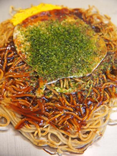 通常の広島風のお好み焼きは、玉子が平べったく仕上げられ、全体を覆っているが、ここでは玉子は中央にちょこんと乗っているだけで、そばが目立つ。パッと見、お好み焼きというより、焼きそばの様。ただ、こうして焼く事で、そばがカリカリに仕上がる。自分好みのお好み焼になっている。- 旅行時期