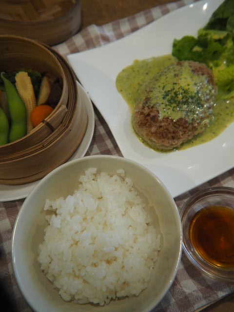 ハンバーグ、野菜のせいろ蒸し、グリーンサラダ、そしてティーから成る。