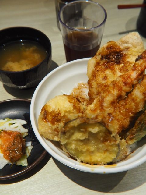 海老2本、豚肉、味付け卵、ピーマン、サツマイモ、ナスの天ぷらがトッピングされている。盛り方は、正面から見るとうず高く、天ぷらの山の様。- 旅行時期