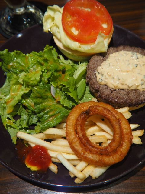 メインのハンバーガーは、大き目のバンズの間にビーフパティトマト、レタス、ピクルスを挟んでいて、ロシアソースを掛けてある。
