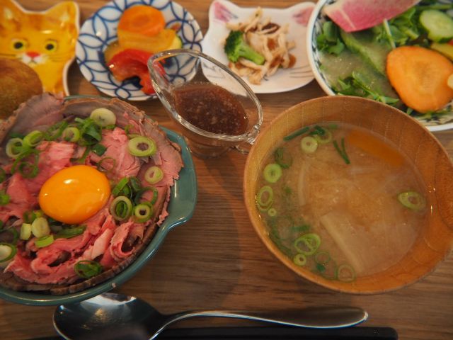 小振りな丼に、ライスを盛り、その上にスライスしたローストビーフをこれでもか、とトッピングし、中心に卵の黄身を乗せ、ネギを塗している。ライスはプレーンの白米と、玄米・黒米・大豆が入った美食米から選べるようになっていたので、美食米にした。柔らかなローストビーフと、ご飯はよく合う。- 旅行時期