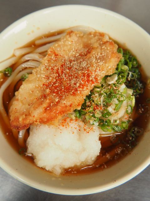 讃岐うどんのぶっかけうどんに、とり天・おろし大根・ネギをトッピング。