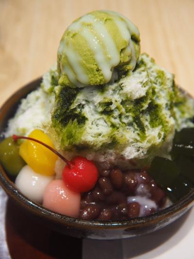 宇治金時のかき氷に、和栗、三色白玉、北海道小豆、抹茶ゼリー、抹茶アイス、さくらんぼをトッピングし、練乳を掛けたもの。