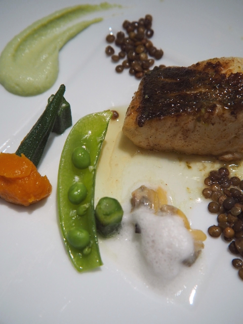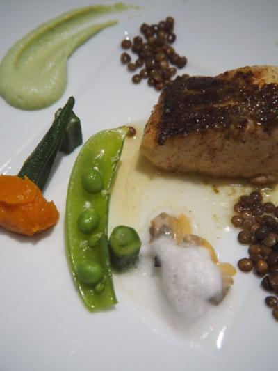 天然すずきのポワレ 香草ソースは、しっかりと火を通したすずきに、香草ソース、アサリのソテー、温野菜が添えられている。香草ソースは、スパイスをたっぷり使っていて、インド料理っぽい。フレンチでインド料理っぽい味付け、というのは奇妙だが、美味しくいただけた。ボリュームも、パッと見以上にある。- 旅行時期