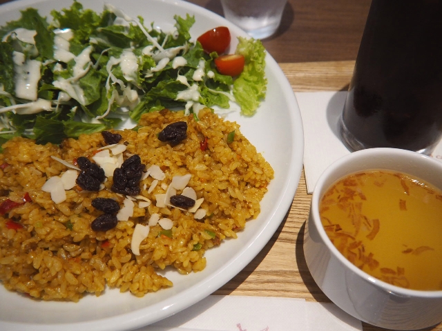 ドライカレーには、スライスアーモンドと、レーズンがトッピングされているのが特徴。ピーマンや赤ピーマン等の野菜が散見し、彩を添えている。