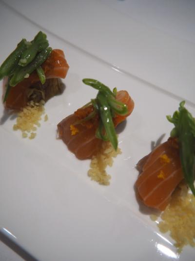 生サーモンのカルパッチョは、ナスのソテーに、生サーモンを被せたもの。クスクスが添えられている。柔らかくソテーされたナスと、プルプルのサーモンとの相性は良い。