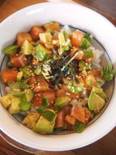 サーモンとアボカドの漬け丼は、当店が提供する丼物の1種。