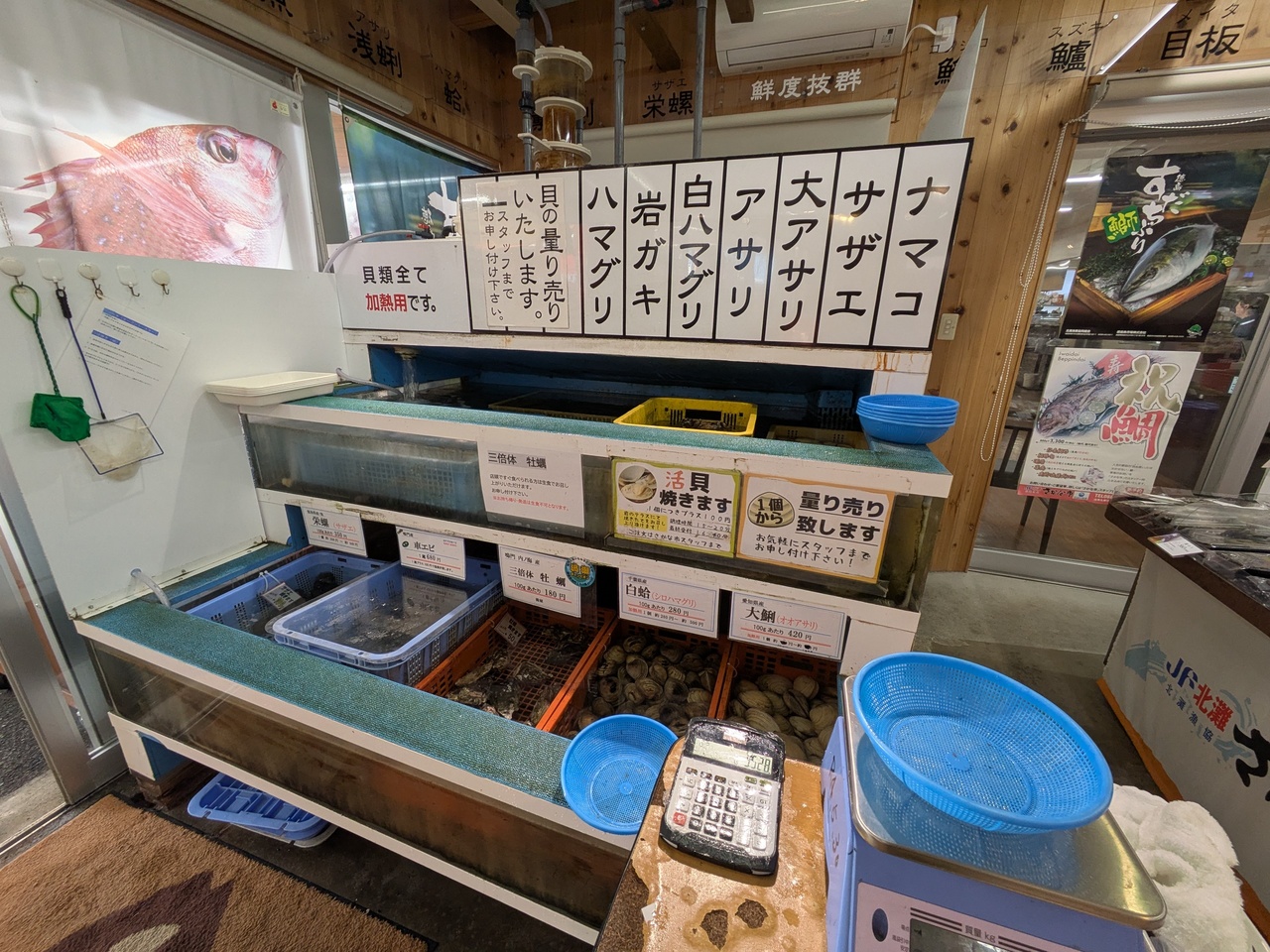 魚では鯛とブリ、貝類では牡蠣やサザエなどが活魚水槽で生きたまま販売されており鮮度はバツグン。値段もお手頃かな。