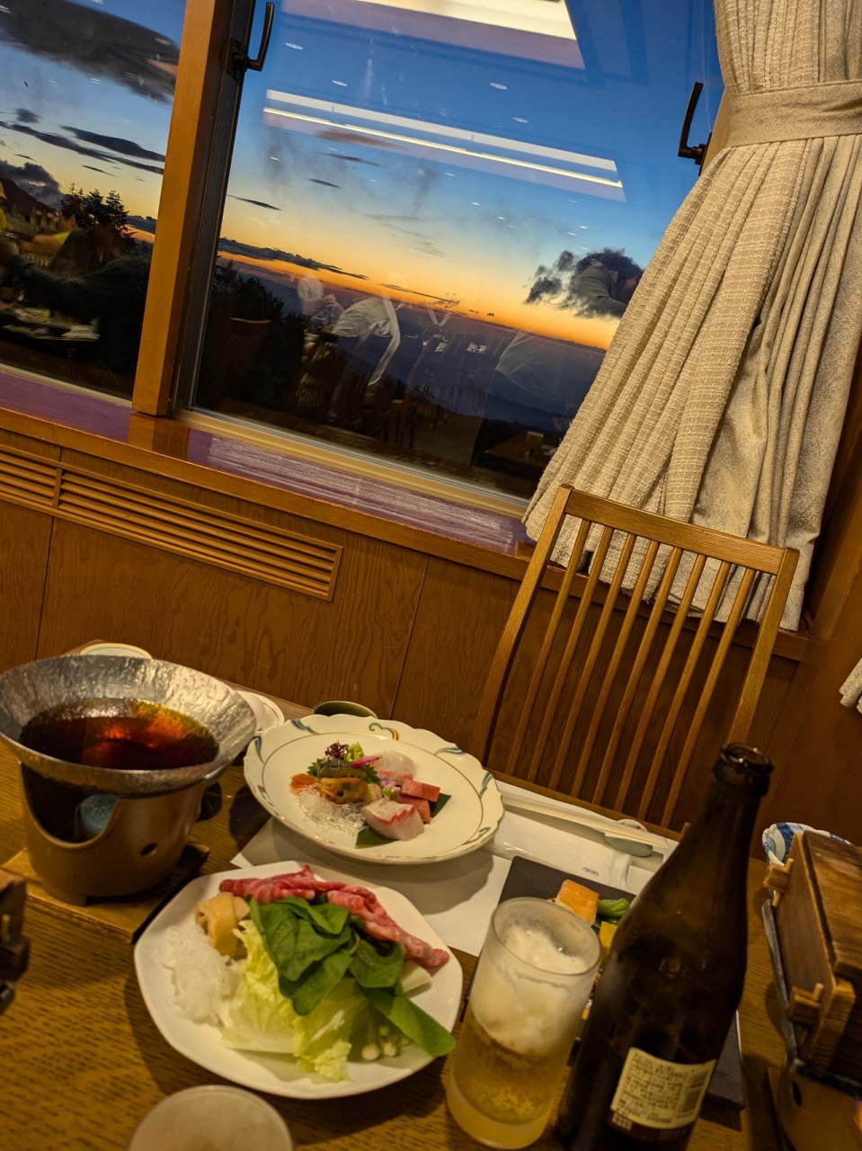 生憎の雨で富士山が雲に隠れていましがっかりしてましたが、夜の中華はカジュアルコースでもどれもとても美味しかったのですが、特に冷やし担々麺が良かったです。ディナー後。一瞬の雲の切れ間で富士山の中腹が見れました。