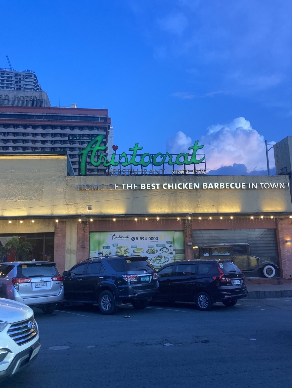 サイドカーに二人、バイクの尻に一人、トライシクルでロハス通りの[アリストクラット]へ晩飯に!